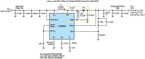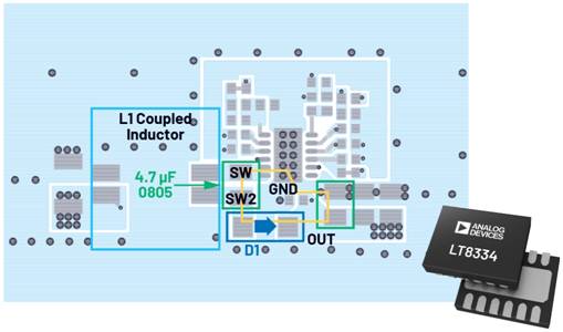 SEPIC轉(zhuǎn)化器熱回路(黃色突出顯示)包含一個分立式續(xù)流二極管和一個耦合電容,不會減弱輻射。