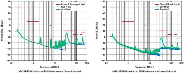 圖9.DC2788A LT3950通過了(a)平均和(b)峰值CISPR 25 5類傳導(dǎo)輻射測試(電流探針方法)。