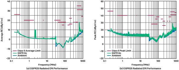 圖11.DC2788A LT3950通過了(a)平均和(b)峰值CISPR 25 5類電磁輻射測試。