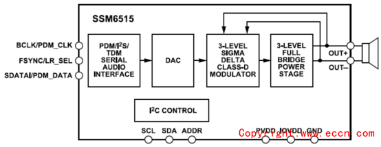 The digital input eliminates the need of an external digital-to-analog converter (DAC). The SSM6515 has a micropower shutdown mode with a typical shutdown current of 6 μA at the 1.8 V PVDD supply and can automatically power down with no input. The device also