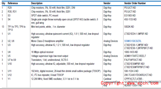 ADI公司的SSM6515是高度集成高效率超低功耗單聲道D類音頻放大器,具有很適合用于無線耳機(jī)的數(shù)字輸入.應(yīng)用電路僅需要很少的外接元件,工作電壓從1.8 V (PVDD)低電源和1.2V到1.8V(IOVDD)電源.這些和1.8V信令能共享.器件能向16 Ω負(fù)載提供<1%總諧波失真+噪音(THD+N)的連續(xù)輸出功率85mW.器件具有2.57 μV rms噪音, 113 dB A加權(quán)信噪比和動(dòng)態(tài)范圍, 30 mW, 1 kHz輸出32 Ω 負(fù)載的THD+N為0.003%,I2C控制有多達(dá)4引腳可選擇地址或單調(diào)的操作.有多種串行數(shù)據(jù)格式,TDM,I2S或左對齊從,PDM輸入從2.8224 MHz 到12.288 MHz. 支持取樣速率從8 kHz 到 768 kHz,具有靈活數(shù)字增益調(diào)整,具有可編角頻率的DC阻隔高通濾波器,高性能模式的典型空閑功率為1.55mW,低功耗模式以降低功耗,靈活的輸出增益限制器和剪裁技術(shù),具有零數(shù)字輸入的自動(dòng)降功耗特性,短路保護(hù)和雜音抑制器,用戶可選擇的超低EMI發(fā)送模式,加電復(fù)位(POR), 1.8 V PVDD電源,1.2 V 到1.8 V IOVDD電源,采用11凸0.984 mm × 1.444 mm, 0.35 mm間距WLCSP封裝.主要用在無線耳機(jī),有源噪音抑制耳機(jī),智能手機(jī)耳機(jī)揚(yáng)聲器,助聽器和手持電子設(shè)備.本文介紹了SSM6515主要特性,功能框圖,典型應(yīng)用電路圖以及評估板EVALSSM6515Z主要特性,電路圖,材料清單和PCB設(shè)計(jì)圖.