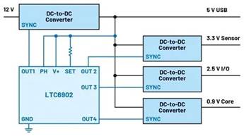 圖3顯示了圖1中采用LTC6902多相振蕩器的電源架構(gòu)。它由5 V電壓供電。該電壓由一個(gè)將12 V轉(zhuǎn)換為5 V的降壓轉(zhuǎn)換器產(chǎn)生。對(duì)于開關(guān)穩(wěn)壓器,如果它們首先使用自己的內(nèi)部振蕩器獨(dú)立啟動(dòng),然后再提供外部時(shí)鐘,則一般不會(huì)有問題。詳細(xì)信息可在相應(yīng)開關(guān)穩(wěn)壓器的數(shù)據(jù)手冊(cè)中找到。
