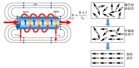 • 當磁芯被完全磁化時,磁疇方向全部和磁場一致,即使再增加外磁場,磁芯也沒有可以旋轉(zhuǎn)的磁疇了,此時的電感就進入了飽和狀態(tài)。