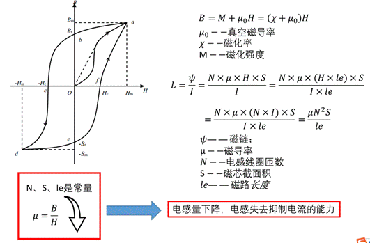 • 當電感飽和后,µ會大幅度減小,最終導致電感量大幅降低,失去抑制電流的能力。