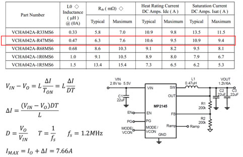 以Buck芯片MP2145為例,可以按照如下公式計算,將計算結(jié)果電感規(guī)格值相比較就能判斷電感是否會飽和。