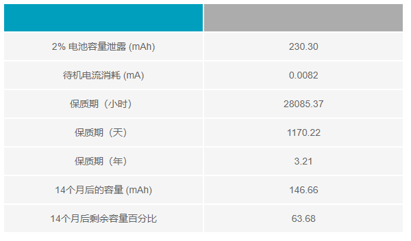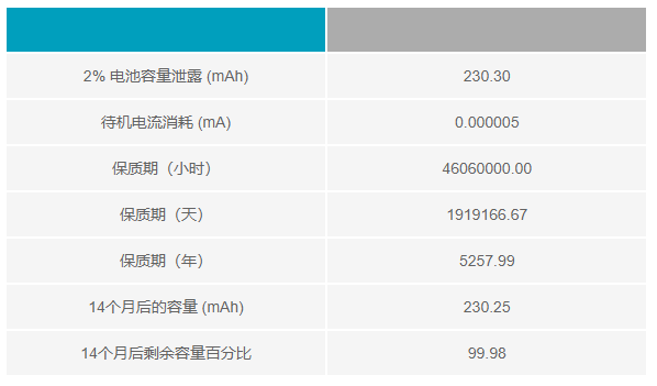 這些計算結(jié)果表明,該器件將滿足5天的工作時間要求,電池壽命超過5.1天。然而,這個結(jié)果具有欺騙性,因為沒有考慮系統(tǒng)的保質(zhì)期。在醫(yī)療器械行業(yè),最好是設(shè)計14個月的保質(zhì)期(貨架期12個月,運輸期兩個月)。
