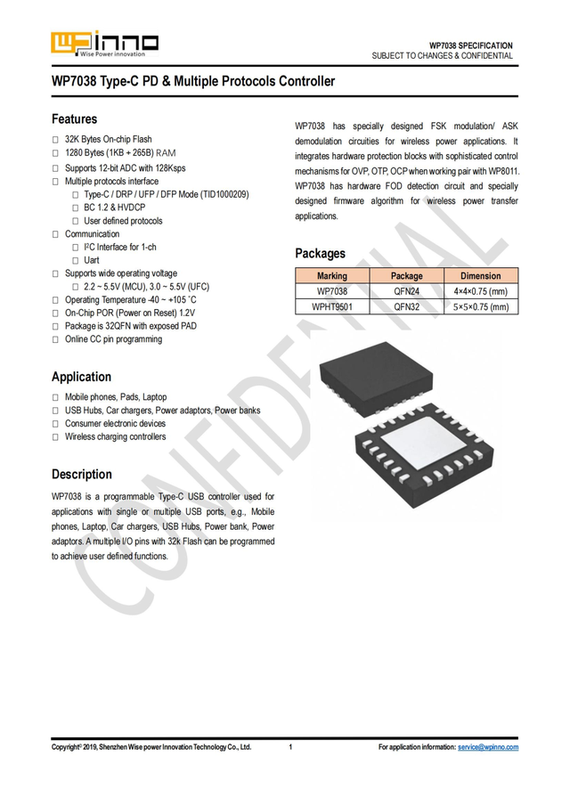 維普創(chuàng)新WP7038是最新推出的Type-C系列IC,具備每個接口獨(dú)立調(diào)節(jié)的全協(xié)議功能;具有輸入電壓范圍廣5-24V,輸出電壓范圍廣3.5-24V(自適應(yīng))和輸出電流1-5A(根據(jù)協(xié)議自適應(yīng))的特點(diǎn);同時內(nèi)置高效MCU,內(nèi)置獨(dú)立全協(xié)議調(diào)節(jié)功能;此外芯片可實(shí)現(xiàn)雙口獨(dú)立輸出,真正實(shí)現(xiàn)雙口雙快充。