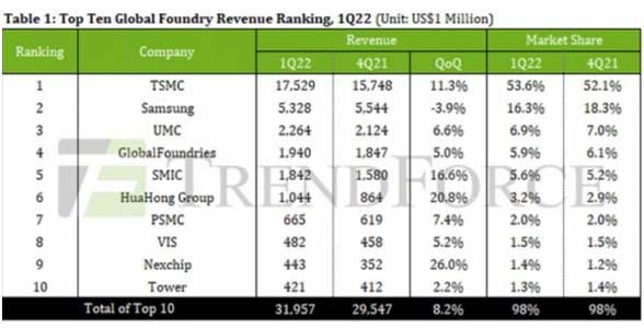 市場研究公司 TrendForce 公布了 2022 年一季度全球十大晶圓代工企業(yè)收入排行榜,臺積電繼續(xù)霸榜,并且進一步擴大了領先優(yōu)勢。