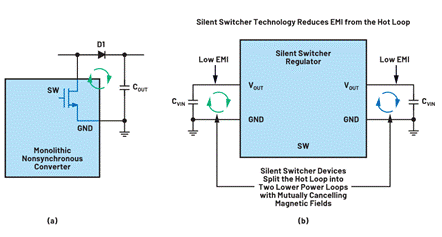 圖1. (A) 異步單芯片升壓轉(zhuǎn)換器具有單個熱回路,其中包含一個外部續(xù)流二極管。(b) Silent Switcher轉(zhuǎn)換器具有兩個(相反)熱回路和全集成開關。