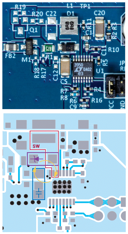 圖2. LT3950 (DC2788A)異步熱回路包括D1續(xù)流二極管。盡管如此,續(xù)流二極 管和輸出電容仍與LT3950 16引腳MSE封裝緊密貼合。突出顯示的異步開關 節(jié)點小且緊湊,但并非不可能。開關節(jié)點的布局可能是實現(xiàn)低輻射結(jié)果的關鍵。