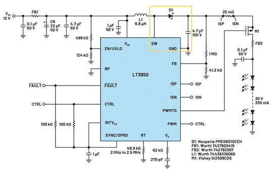 圖3. LT3950 LED驅(qū)動器是一個異步單芯片1.5 A、60 V升壓轉(zhuǎn)換器。升壓轉(zhuǎn)換器熱回路(黃色突出顯示)包含一個分立式續(xù)流二極管,不會減弱高頻率輻射。