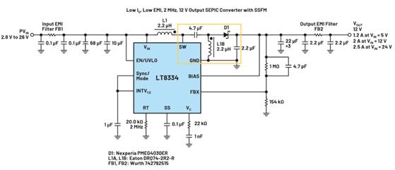 圖4. LT8334 40 V、5 A異步單片式升壓IC被用于SEPIC應用中。SEPIC轉(zhuǎn)化器熱回路(黃色突出顯示)包含一個分立式續(xù)流二極管和一個耦合電容,不會減弱輻射。