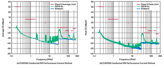 圖9. DC2788A LT3950通過了(a)平均和(b)峰值CISPR 25 5類傳導輻射測試(電流探針方法)。