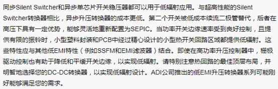 帶分立式續(xù)流二極管的異步轉(zhuǎn)換器仍然可以實現(xiàn)低輻射。如果在設計時特別注意熱回路布局和dV/dt開關邊緣速率,那么有可能使用異步轉(zhuǎn)換器實現(xiàn)低EMI開關應用。在展頻(SSFM)中集成降低輻射的額外措施是必要的。單芯片開關穩(wěn)壓器,例如 LT3950 60 V、1.5 A異步LED驅(qū)動器和 LT8334  40 V、5 A異步升壓轉(zhuǎn)換器,每個都在器件中集成了單個低端電源開關,但它們依賴外部續(xù)流二極管,同時仍然可以實現(xiàn)低輻射!它的工作原理是什么呢?