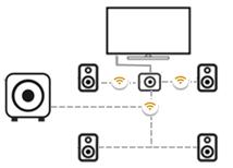 利用智能中心揚(yáng)聲器通過(guò)ARC/eARC連接到高清電視,用無(wú)線方式連接2個(gè)前置揚(yáng)聲器,2個(gè)后置揚(yáng)聲器和一個(gè)低音炮,以實(shí)現(xiàn)一個(gè)完整的5.1沉浸式系統(tǒng)。