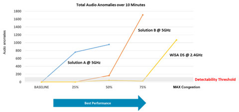 從歷史上看,在擁塞度為50%的環(huán)境中能夠運(yùn)行的無(wú)線音頻解決方案即被認(rèn)為是非常好的方案。WiSA的解決方案能夠在擁塞度為75%的環(huán)境中運(yùn)行,是無(wú)線音頻技術(shù)的重大突破。