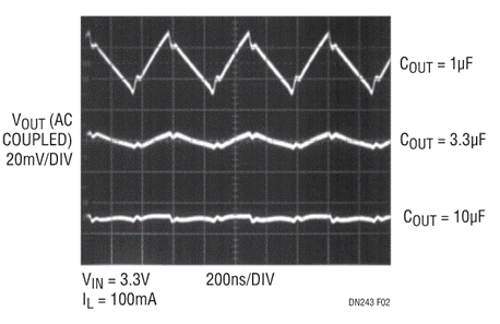 即使采用小型輸出電容器,器件的2MHz振蕩頻率也可允許低輸出紋波,圖2給出了LTC3200-5采用不同值的輸出電容器支持100mA負(fù)載電流時(shí)的輸出紋波情況。