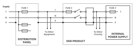 通過有線 AC 連接到機(jī)箱連接器的內(nèi)部電源必須在入口處包括合適的單保險(xiǎn)絲或雙保險(xiǎn)絲(視情況而定)。請記住,最終產(chǎn)品交流保險(xiǎn)絲保護(hù)上游電纜和連接,而不是內(nèi)部電源,以防止短路和過載。當(dāng)然,它必須通過正常運(yùn)行電流并留有一定的浪涌余量,但它也應(yīng)該在機(jī)箱連接器和電源之間對(duì)地短路后保險(xiǎn)絲斷開之前進(jìn)行額定,以使連接到最終產(chǎn)品的外部交流電纜不會(huì)過載供應(yīng)。即使外部電纜的額定電流非常高,保險(xiǎn)絲的分?jǐn)嘀狄矐?yīng)低于任何上游保險(xiǎn)絲或斷路器,以避免導(dǎo)致多個(gè)電路斷開的故障,即正確的保險(xiǎn)絲“協(xié)調(diào)” - 一個(gè)關(guān)鍵問題在專業(yè)環(huán)境中(圖 2)。