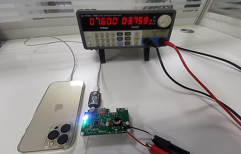 水芯 M12229 支持 AABCL 接口,支持 PD3.1/AVS、PD3.0/PPS、QC3.0、QC2.0、AFC、FCP、SCP、APPLE 2.4A、BC1.2 DCP 等充電協議。在 7.6V 輸入條件下,使用 iPhone 13 Pro Max 測試水芯 M12229 Demo 的快充兼容性。