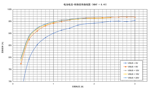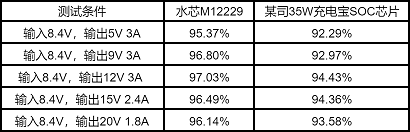 上圖為水芯 M12229 在 8.4V 輸入時,輸出5V、9V、12V、15V、20V的輸出效率曲線。水芯 M12229 刷新了35W升降壓充電寶的效率記錄。由于集成了高效率的DC-DC電壓變換器和多種補償電路,M12229的最大放電效率可達97%+,比競品方案高3%以上,效率表現業(yè)界領先。