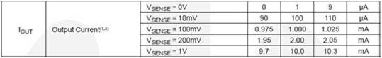 其中Vin為輸入電壓,Iout_fs的值則是表1中的對應(yīng)值,在不同的最大Vsense時,其值不一樣。例如,若最大的Vsense為500mV時,則Iout_fs=5mA。