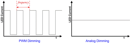 在PWM dimming狀態(tài)下,LED亮度會有”亮“、”暗”兩個狀態(tài),不同PWM duty下可以呈現(xiàn)出不同的亮度,當(dāng)PWM dimming的頻率過低的時候會出現(xiàn)頻閃(Flicker)問題。采用analog dimming的話LED會恒亮,在dimming過程中IC只會改變輸出電流值,LED亮度也會跟著改變,不會有頻閃(Flicker)問題。