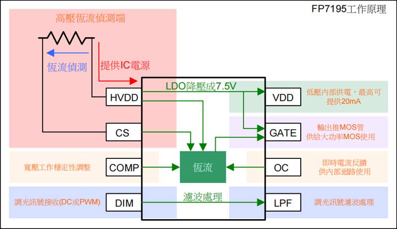 FP7195最大占空比可達(dá)100%,所以在操作時候輸入電壓可以幾乎等于LED電壓(電路元件會有壓降・所以不會輸人電壓等于ED電壓)・當(dāng)輸入電壓低于LED電壓后FP7195會讓MOS全開・當(dāng)輸入電壓掉低于LED電壓后輸出しED電流會跟著往下降。一旦輸入電壓高于LED電壓后可馬上回復(fù)正常恒流輸出。