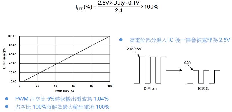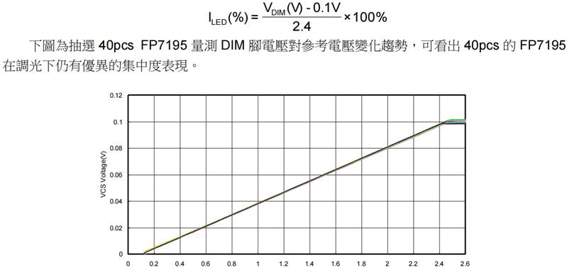 模擬調(diào)光 FP7195 同時也支援模擬調(diào)光(DC 調(diào)光),只要在 DIM 腳輸入 0.1~2.5V,即可控制輸出電流 0.1%~100%(參考電壓 0.1mV~100mV)。DIM 腳電壓(VDIM)與電流百分比(ILED(%))換算式如下: