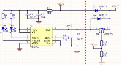 1) 圖中VBUS是外部輸入的5V電源,VBAT接到鋰電池正端,VOUT是整個電路的輸出;