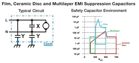 圖6:薄膜、陶瓷片和多層EMI抑制電容器典型電路及安規(guī)電容器圖(圖源:Vishay)
