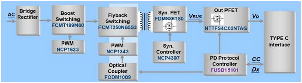 由于電源輸出功率在75W以上,就需要在電路設(shè)計中增加PFC電路來達到高功率因數(shù)下的行業(yè)標準。因此,本方案除了采用onsemi旗下新一代QR Flyback控制器NCP1343外,還在電路前級使用onsemi NCP1623作為PFC級的控制,提高了設(shè)計需求。并在輸出控制級增加onsemi FUSE15101的設(shè)計滿足了PD3.0/PPS協(xié)議標準。