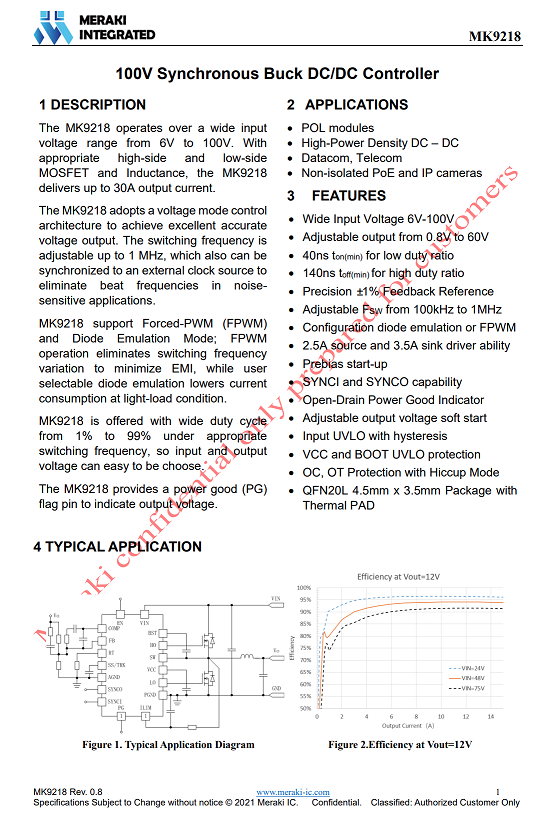 MK9218可用于負(fù)載點(diǎn)模塊,高功率密度直流電壓轉(zhuǎn)換,數(shù)據(jù)和電信應(yīng)用,非隔離PoE和網(wǎng)絡(luò)攝像頭等高壓降壓應(yīng)用。得益于高壓輸入,非常適合應(yīng)用在USB PD3.1充電器以及相關(guān)的降壓應(yīng)用場(chǎng)合,提供高輸入耐壓,高效率的電壓轉(zhuǎn)換。
