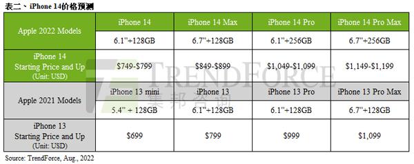 第二季為蘋果新舊機(jī)種交接的過(guò)渡期,且多為年度生產(chǎn)表現(xiàn)最低的一個(gè)季度。第二季因上海、昆山等地受疫情影響,在供應(yīng)鏈補(bǔ)給受到?jīng)_擊的狀況下,第二季仍有 4,820 萬(wàn)部的產(chǎn)出,位居全球第二。TrendForce 還預(yù)測(cè)了即將發(fā)布的 iPhone 14 系列新機(jī)的售價(jià),稱四款新機(jī)當(dāng)中的 iPhone 14 Pro 及 Pro Max 處理器將升級(jí)至 A16(TSMC 4nm),存儲(chǔ)器起始容量提升至 LPDDR5 6GB 以及 256GB,主鏡頭像素增加為 4,800 萬(wàn),加上 Face ID 外觀設(shè)計(jì)變更等,預(yù)估起始定價(jià)也將隨之上揚(yáng)。不過(guò)在全球高通脹以及匯差的壓力下,蘋果可望采取更謹(jǐn)慎的定價(jià)格策略以免影響銷售表現(xiàn),預(yù)估價(jià)格上漲幅度應(yīng)有機(jī)會(huì)落在 100 美元以內(nèi),售價(jià) 749 美元(約 5175.59 元人民幣)-1199 美元(約 8285.09 元人民幣)。