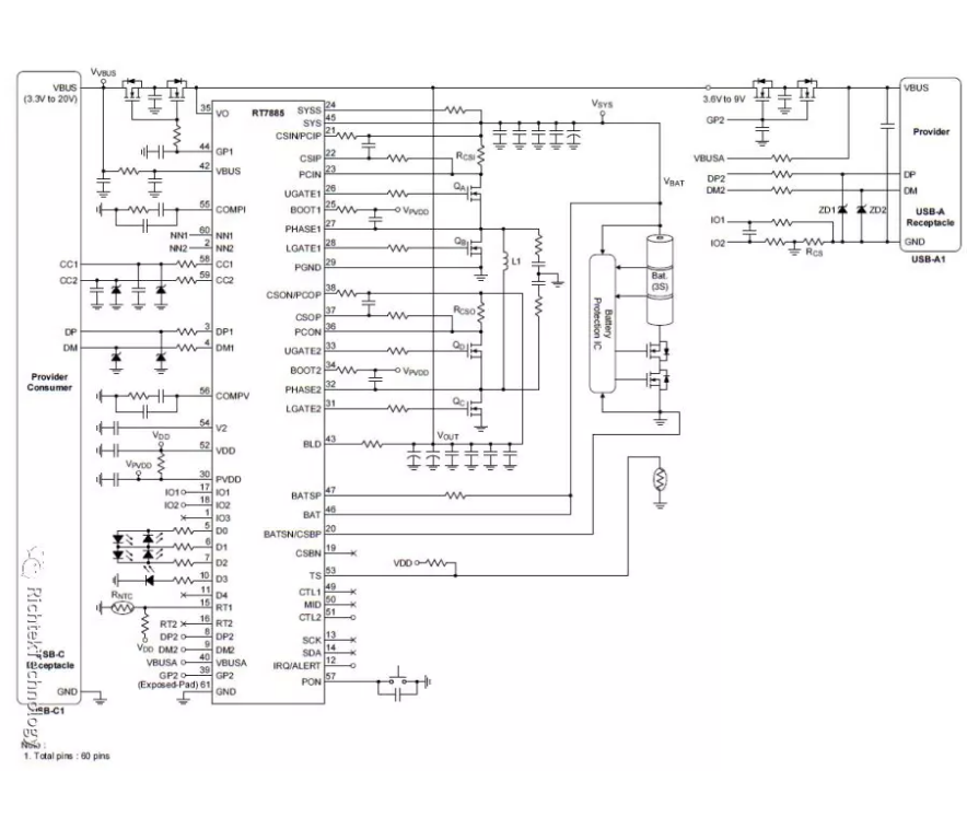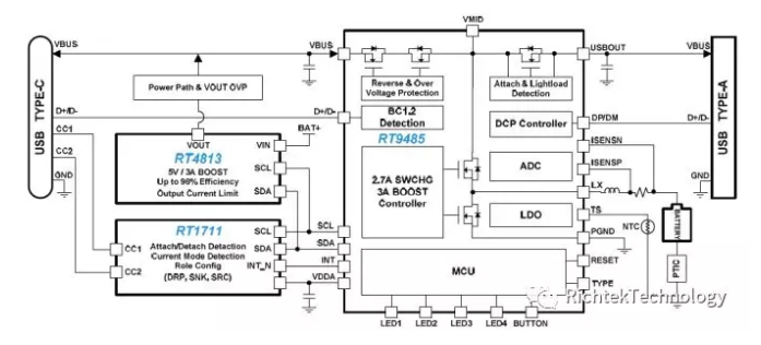 在探索 USB Type-C 接口移動電源解決方案的過程中,立锜曾經(jīng)設(shè)計過一種各部獨立的解決方案,如下圖所示(僅供參考,不要考慮用它):