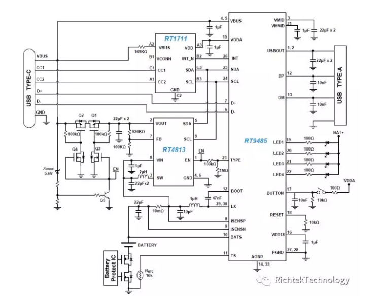 其中的 RT9485 是一款獨立的移動電源芯片(現(xiàn)在沒有對外銷售),可以 Buck 模式為電池充電,也可以 Boost 模式為外部設(shè)備供電,內(nèi)含 MCU 可以操控所有的事情。當(dāng)需要通過 USB Type-C 接口對外供電的時候,Boost 轉(zhuǎn)換器 RT4813 進入工作狀態(tài),其輸出用電子開關(guān)接入 VBUS,完成對外供電的功能。RT1711 是 USB Type-C 接口控制器和 PD 協(xié)議處理器,它是使得這樣組合起來的系統(tǒng)能符合 PD 標準要求的必要部分。整個系統(tǒng)的電路如下圖所示: