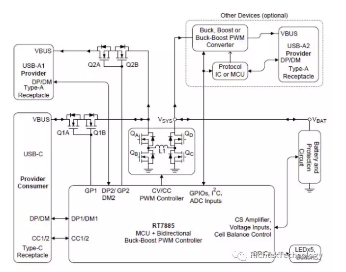 RT7885 是目前最強的移動電源解決方案之一,而且它還有一個重要的特性Bidirectional,即“雙向的”,它說明RT7885內(nèi)含的Buck-Boost轉(zhuǎn)換器是可以雙向工作的,這是設(shè)計中的關(guān)鍵之處,它的使用最大化地簡化了產(chǎn)品結(jié)構(gòu),讓高性能移動電源的設(shè)計變成了可能。