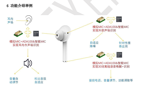 將麥克風的模擬mic與ADA100相結合可以對于耳內的聲場進行識別,從而實現(xiàn)音量和音效的自適應調節(jié);對于外部聲場也能進行識別,從而做出自適應降噪,降低降噪消耗的功耗,提升續(xù)航時間;ADA100還擁有30個關鍵詞的識別,可以通過語音控制來進行電話的接掛、音量大小的調控、音樂的切換等人機交互功能,更加的快速便捷。