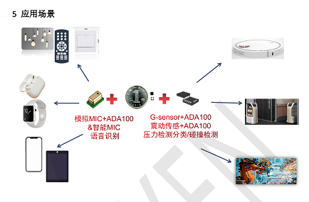 ADA100搭配麥克風可以應用到許多智能設備上,例如TWS耳機、智能手環(huán)、手機和平板電腦的人工智能助手、智能遙控器、智能開關、智能家居等,使用場景相當廣泛。