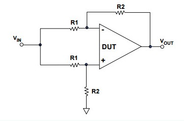 有不同的方法來(lái)測(cè)量共模抑制比。在下圖中,小編將運(yùn)算放大器配置為差分放大器的四個(gè)精密電阻。一個(gè)信號(hào)應(yīng)用于兩個(gè)輸入,測(cè)量輸出的變化,一個(gè)具有無(wú)限CMRR的放大器也沒(méi)有輸出變化。