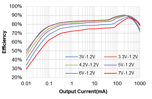 • 1.2MHz高開關(guān)頻率,可以使用小封裝的電感電容等無源器件,進(jìn)一步減低電源方案的尺寸。