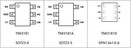 • 提供不同封裝需求,包括通用的SOT23-6(TMI3181帶PG),SOT23-5(TMI3181A)以及超小型DFN1.6x1.6-6封裝。為客戶提供通用兼容性和小封裝的選擇。