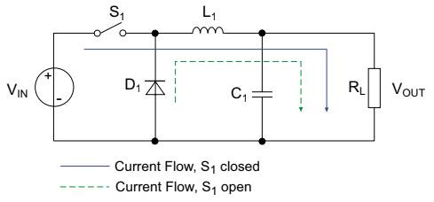 降壓轉(zhuǎn)換器是一種DC/DC開關(guān)電源,將非穩(wěn)壓的直流輸入電壓降低以達到穩(wěn)定的低輸出電壓。與傳統(tǒng)的穩(wěn)壓器相比,由于降壓轉(zhuǎn)換器具有較高的效率,可以輕易超過95%因此廣受重視。下方的簡化電路圖顯示了降壓轉(zhuǎn)換器開關(guān)期間的電流路徑。