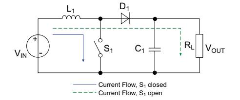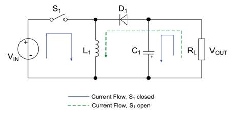 升壓轉(zhuǎn)換器是一種DC/DC開關(guān)電源,將非穩(wěn)壓的直流輸入電壓升高以達到穩(wěn)定的高輸出電壓。與降壓轉(zhuǎn)換器相似,升壓轉(zhuǎn)換器依靠電感器、二極管、電容器和開關(guān)管來調(diào)節(jié)輸出電壓,但是它們的配置方式不同。下面的簡化電路圖展示了升壓轉(zhuǎn)換器開關(guān)期間的電流路徑。