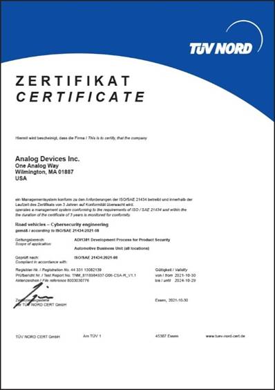 ADI公司預(yù)料到了ISO/SAE 21434標(biāo)準(zhǔn)在草案期間解決的核心網(wǎng)絡(luò)安全問(wèn)題,并在wBMS設(shè)計(jì)和開發(fā)過(guò)程中采納了相關(guān)應(yīng)對(duì)措施。目前,ADI是首批在政策和流程方面實(shí)現(xiàn)ISO/SAE 21434合規(guī)性的技術(shù)供應(yīng)商,ADI wBMS技術(shù)正在接受最高網(wǎng)絡(luò)安全保障等級(jí)認(rèn)證。 |