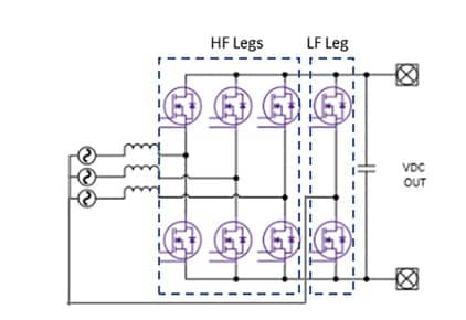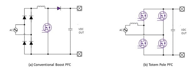 在輸入端,傳統(tǒng)的PFC升壓轉(zhuǎn)換器是使用最廣泛的單相拓撲,但它不支持雙向操作并且效率相對較低。圖騰柱PFC通過消除橋式整流器級來提高效率,將傳導路徑中的半導體器件數(shù)量從三個減少到兩個。