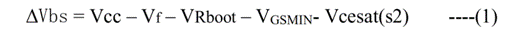 當(dāng)下管S2導(dǎo)通,Vs電壓低于電源電壓(Vcc)時自舉電容(Cboot)每次都被充電。自舉電容僅當(dāng)高端開關(guān)S1導(dǎo)通的時候放電。自舉電容給高端電路提供電源(VBS)。首先要考慮的參數(shù)是高端開關(guān)處于導(dǎo)通時,自舉電容的最大電壓降。允許的最大電壓降(Vbs)取決于要保持的最小柵極驅(qū)動電壓。如果VGSMIN最小的柵-源極電壓,電容的電壓降必須是: