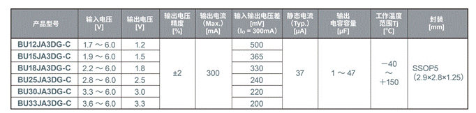 新產(chǎn)品“BUxxJA3DG-C系列”滿足對車載產(chǎn)品的基本要求,比如125℃工作、符合汽車電子產(chǎn)品可靠性標準“AEC-Q100”、車載二次側(cè)LDO穩(wěn)壓器所需的小封裝尺寸以及輸出電壓擴展需求。