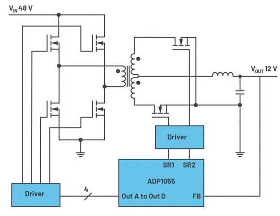 圖1. ADP1055數(shù)字開關(guān)穩(wěn)壓器的全橋應(yīng)用。