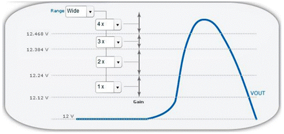 在圖3的示例中,設(shè)置的標(biāo)稱輸出電壓為12 V?烧{(diào)控制環(huán)路增益可以設(shè)置為多個(gè)值,具體由輸出電壓決定。例如,如果因?yàn)?誤差放大器的增益增加,使得電壓升高至12.12 V以上,則可以在對應(yīng)的下拉菜單中設(shè)置控制環(huán)路。還有三個(gè)其他的電壓閾值高 于12.12 V,可以使用獨(dú)立的增益設(shè)置。注意,這些增益設(shè)置與在設(shè)計(jì)穩(wěn)壓環(huán)路時(shí)設(shè)置的極點(diǎn)和零點(diǎn)完全無關(guān)。
