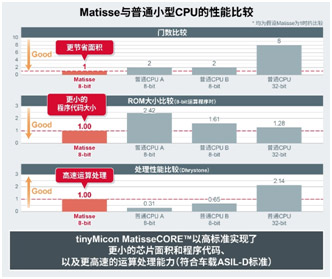 tinyMicon MatisseCORE™(Matisse: Micro arithmetic unit for tiny size sequencer)是ROHM自主開(kāi)發(fā)的8位微處理器(CPU),該產(chǎn)品旨在隨著物聯(lián)網(wǎng)技術(shù)的發(fā)展來(lái)提高模擬IC的智能化程度。憑借針對(duì)嵌入式應(yīng)用而優(yōu)化的指令集和最新的編譯器技術(shù),以高標(biāo)準(zhǔn)實(shí)現(xiàn)了更小的芯片面積和程序代碼、以及更高速的運(yùn)算處理能力。此外,該產(chǎn)品還符合汽車(chē)功能安全標(biāo)準(zhǔn)“ISO 26262”、ASIL-D等的要求,適用于對(duì)可靠性要求高的應(yīng)用。另外,利用內(nèi)置的自有“實(shí)時(shí)調(diào)試功能”,在調(diào)試時(shí)的處理可以完全不影響應(yīng)用程序的運(yùn)行,因此能在應(yīng)用產(chǎn)品工作的同時(shí)進(jìn)行調(diào)試。